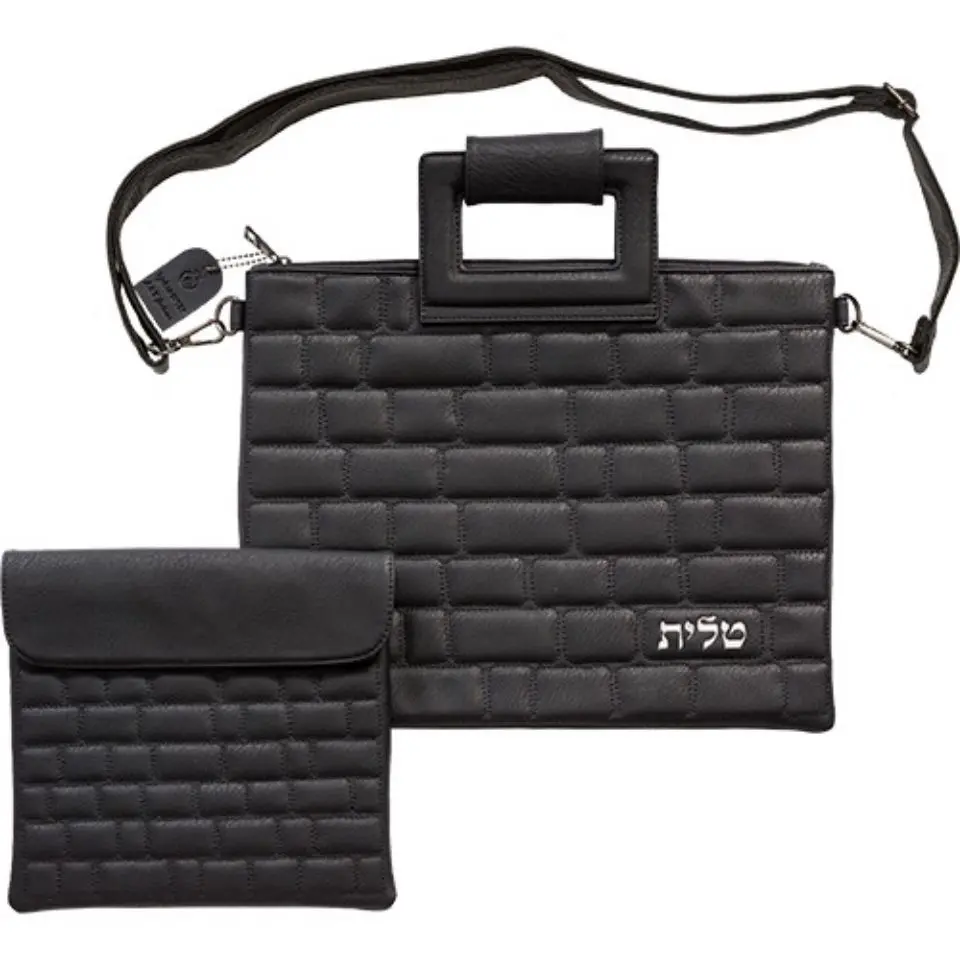 תיק מפואר לטלית ותפילין דמוי עור שחור – אותיות בולטות – כולל ידית ורצועה