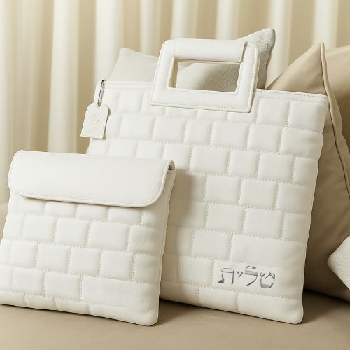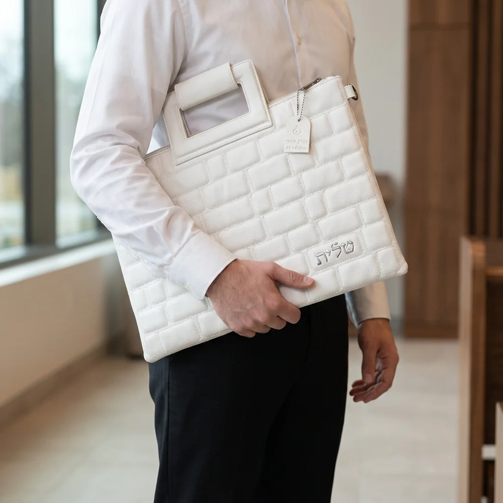 תיק מפואר לטלית ותפילין דמוי עור לבן – אותיות בולטות – כולל ידית ורצועה