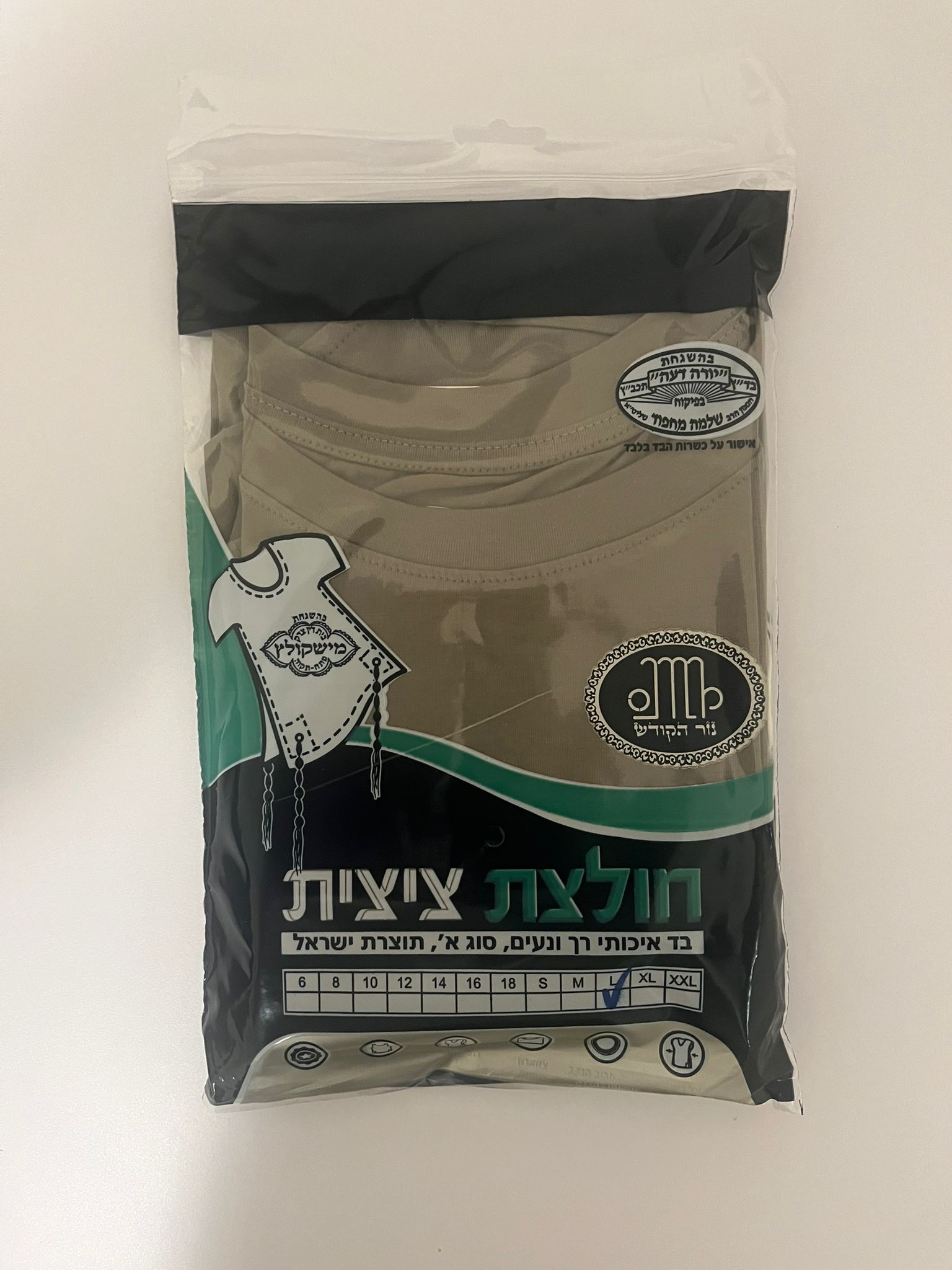 חולצת ציצית 100% כותנה, פתיל 100% צמר, קשירה עבודת יד, בהכשר בד"ץ מישקולץ פ"ת, ובהכשר בד"ץ "יורה דעה".